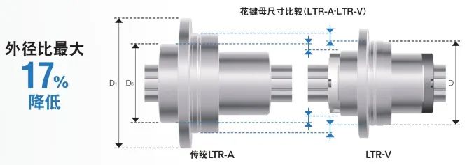 LTR-V型在滾珠花鍵部采用LT-X型,比傳統(tǒng)型號(hào)LTR-A型更小。
