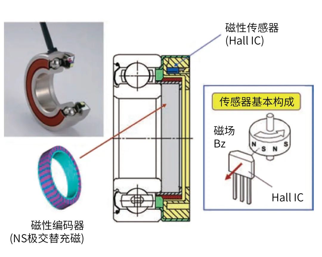 帶旋轉傳感器軸承如圖1所示,其構造為在軸承的內部裝入了磁性傳感器和磁性編碼器,已有標準深溝球軸承數個型號實施了產品系列化。由于使用了磁性傳感器,和一般的光學傳感器相比,它耐污染,也可以在高溫環境中使用。這種軸承適用于叉車上的驅動電機控制和車輪防滑控制。