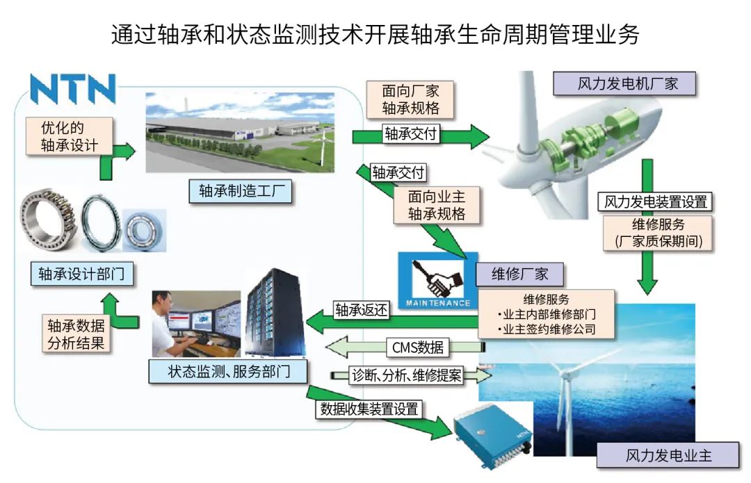 在風力發電領域,NTN與Hokutaku有限公司合作,啟動了維護業務。通過基于CMS信息優化風力發電設備的運行和維護(智能維護),并在軸承開發和采購以及運行和維護服務方面進行合作,如圖14所示,開展軸承生命周期管理業務,努力貢獻于社會。